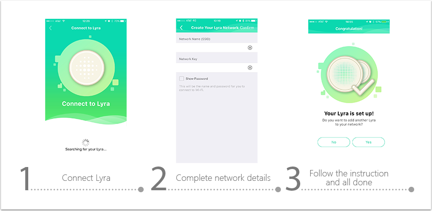 First you will setup the first device and create the network, Next you will need to plug in and add a Lyra device to the network one by one.